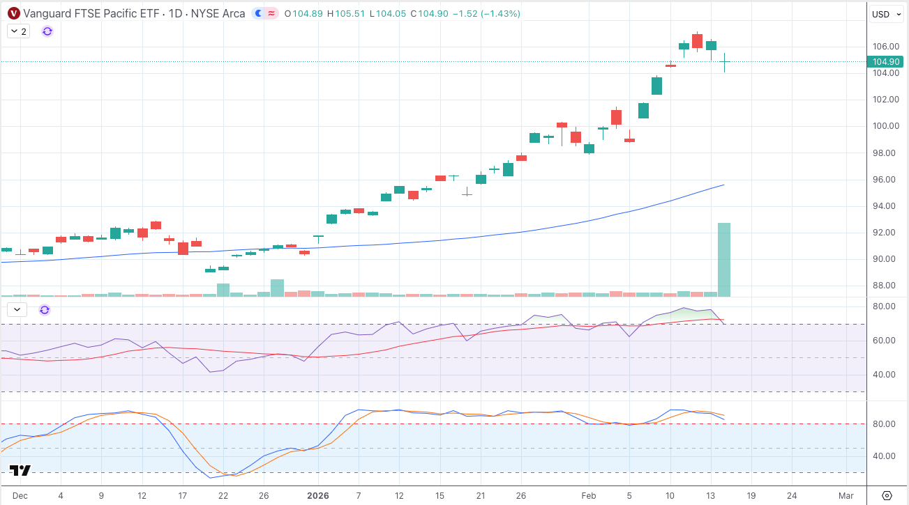 VPL has rallied roughly 23% from its December lows near $87 to the Feb 12 high of $107.13 — a mature move. RSI sits at 69.62, standing on overbought's doorstep. The stochastics tell the sharper story: %K at 85.31 has crossed below %D at 90.55, a bearish crossover in overbought territory.
